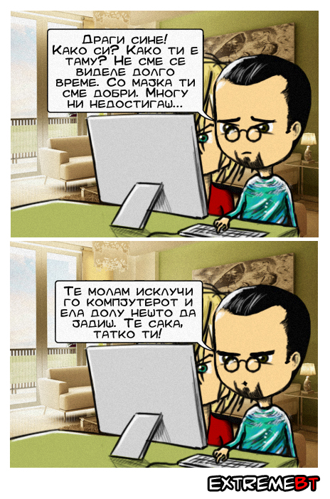 Za kraj ovog pregleda, par prizora od Nikole Vojnovskog (Strip poraka -Dragi sine…), što bi predstavljalo jasnu satiru na naše savremene navike!