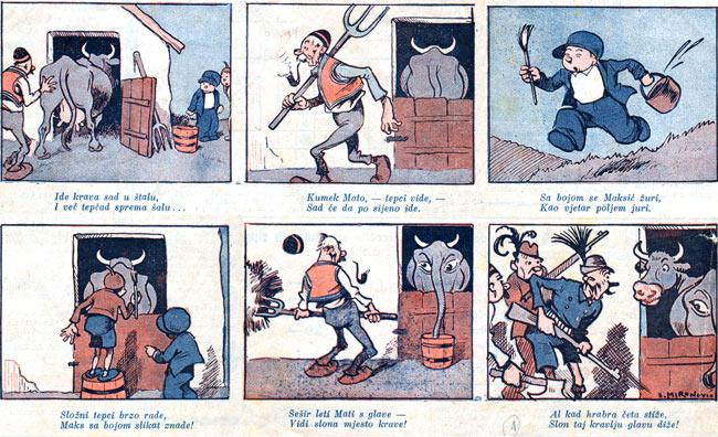 pitanju je Sergej (Sergije) Mironovič Golovčenko (1898 – 1937) koji je u svom nedugom životu ostavio značajan trag u devetoj umetnosti na području Kraljevine Jugoslavije (SHS), a sada ga pominjemo i u kontekstu jednog zapaženog jubileja. Dete južnosibirskih predela (r. u Irkutsku), nakratko dobrovoljac u 1. svetskom ratu, u kome je bio ranjavan i odlikovan, postao je  čak i oficir-husar; kasnije se, dakle,  obreo u jednoj novoj zemlji, a karijeru je uglavnom izgrađivao u Zagrebu, postavši poznat po prezimenu (patronimu) Mironović. Naime, njegov strip o dvojici nestašnih dečaka, Maks i Maksić, pojavio se baš s početka aprilskih dana te davne 1925, u zabavno-satiričnom časopisu Koprive – malo li je 100 godina! Da, to su bili samo gegovi na jednoj tabli stripa (u to vreme se, bar za početak, ni u svetu nije baš moglo računati na više) ali značajno je što je to prvi hrvatski, i prvi jugoslovenski standardni strip serijal! Zahvaljujući popularnosti dela, doživljaji ovih junaka su za života autora pretočeni u neka četiri namenska albuma (prvi već 1926), a to je i na nivou Evrope bio jedan od prvih primera da se stripovi pojave u samostalnom izdanju kao glavni sadfžaj!
