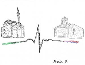 Na crtežu se nalazi Altun Alem džamija i crkva Svetog Petra i Pavla, obije bogomolje su u Novom Pazaru.