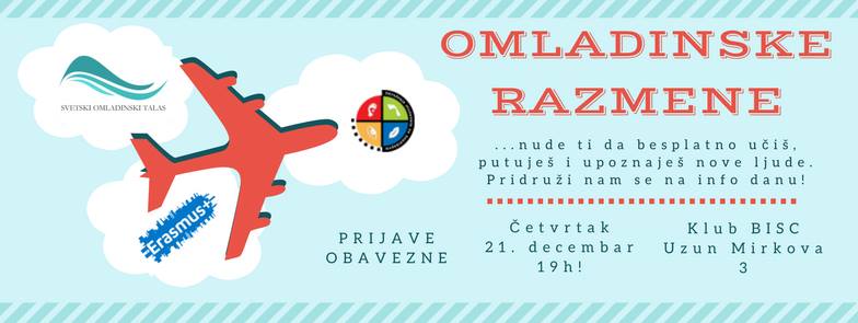 Svetski omladinski talas i Udruženje studenata sa hendikepom te pozivaju na „Info dan o omladinskim razmenama” koji će se održati 21. decembra, od 19 časova, u BISC klubu u Uzun Mirkovoj 3, Beograd. Predstavićemo ti projekte za mlade finansirane od strane Evropske Unije i učestvovaćeš u zanimljivoj kreativnoj radionici.