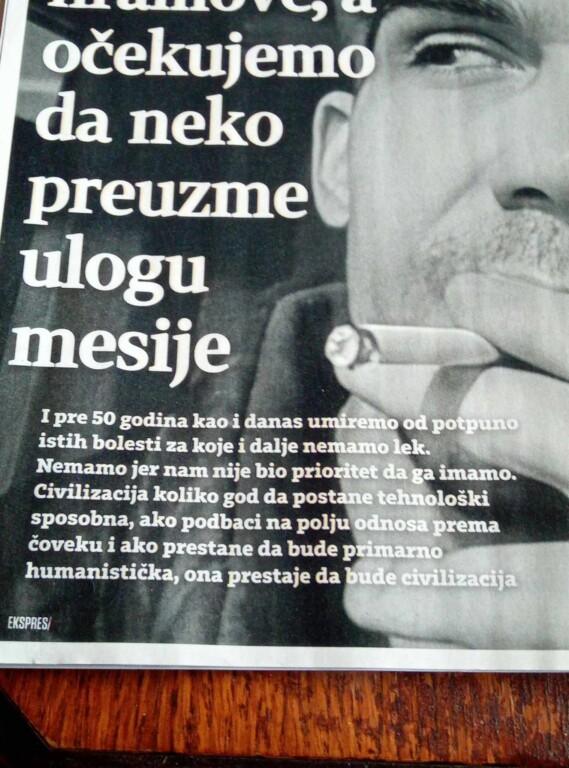 „I pre 50 godina i danas umiremo od potpuno istih bolesti za koje i dalje nemamo lek. Nemamo jer nam nije bio prioritet da ga imamo. Civilizacija koliko god da postane tehnološki napredna, ako podbaci na polju prema čoveku i ako prestane da bude primarno humanistička, onda prestaje da bude civilizacija.“ (iz intervjua)