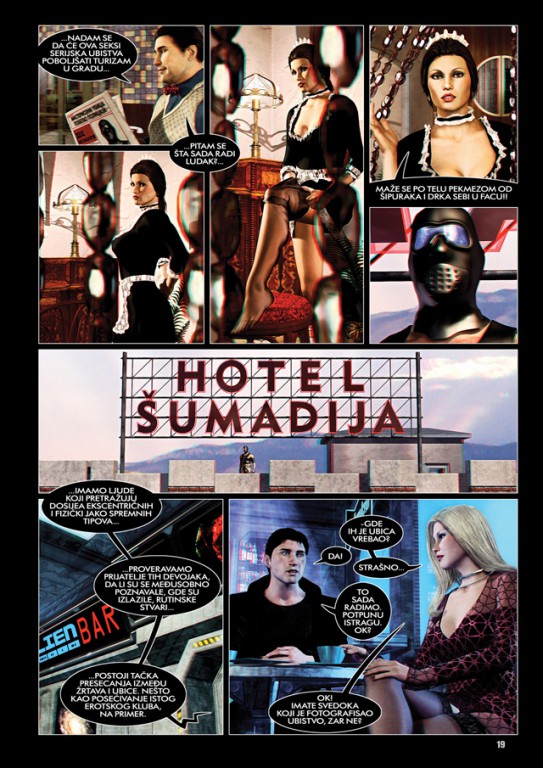 Drugi faktor je sama priča „Gradskih priča“, i tu imamo dosta prvenaca. Ovo je prva srpska grafička novela da se bavi ubistvima i istragama smeštenim u uverljivu budućnost, kao i prva da simulira američke krimi drame poput „CSI [udeni grad ovde]“ ili „NCIS“ ili još kakav drugi simpatični akronim. Samim tim je i prva koja za fokus ima masakrera kalibra Zodijačkog ubice. I, možda najprimetnije, prva da se bavi sadomazohizmom kao pretežnim motivom dela. Ubica nosi odeždu sličnu mazohističkim robovima, ili pak sadističkim dominatriksima (neretko postoji intersekcija u garderoberskom smislu; verovatno jedina prava sličnost ta dva dijametralno različita pojma) iako se ni u kom trenutku ne ponaša kao jedna ili druga kategorija. No, počinitelj nije ni toliko bitan koliko sama fabula. Ova buduća Srbija, u kojoj je Despotovac metropola veličine Čikaga (ovako je tek nešto veći od Svilajnca, i podjednako rupčagast), i dalje ima iste probleme, sa povećom listom novih. Legalizacija marihuane ne poboljšava nestašicu posla, niti smanjuje nasilje na ulici, masovno otpuštanje, gomilanje naroda po centrima za zbrinjavanje nemoćnih lica, zločin na kub (ne računajući lateksiranog ubicu koji hara po ulicama Despot-cityja i ubija žene između treće i četvrte decenije života), i objektivno najgore od svega toga – letargiju naroda. Prve dve osobe na koje nalećemo u stripu su advokatesa i radnik na kiosku. Ona u poznijim godinama, bez momka/muža, sama u svom stanu. On za kioskom, džoint u ustima, ni briga na ovom ili onom svetu. Iako znaju da se ubica kreće gradom, interesuje ih koliko Svevišnjeg prvi nokat kojeg je prvi čovek na Zemlji ikada odsekao. Sličan vajb se oseća i kod policajaca koji istražuju slučaj. Iako su akteri, inspektor Jovan Marić, njegova koleginica Jelena i njihov kineski kolega – s originalnim nadimkom „Kinez“ – su tek toliko aktivni koliko im posao nalaže. Iako balončići naglašavaju bes i odlučnost, pokreti odišu tromošću. No, ovo je vrlo verovatno i do limitacija 3D modela na štampanom medijumu, koji i pored dodatnog 3D efekta ne dobija puno na dinamici.
