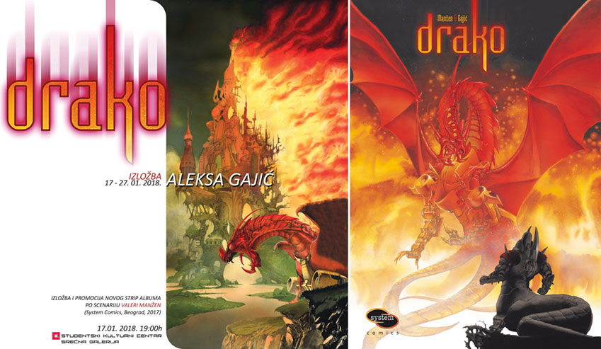 SREĆNA GALERIJA Studentskog kulturnog centra Beograd (SKC) ima čast da pozove Vas i Vaše prijatelje na otvaranje izložbe strip tabli ALEKSE GAJIĆA iz najnovijeg albuma „DRAKO – TRINAESTA HORDA“, scenaristkinje Valeri Manžen (System Comics, Beograd, 2017), u sredu, 17.01.2018. u 19:00 časova i nakon toga na promociju istoimenog albuma u Velikoj Sali SKC-a u 19:30 časova. • Izložba traje do 27. januara 2018. godine • Radnim danima: 11:00 -18:00, subotom: 11:00 -15:0o