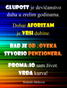 Kataklizma, epigrami; Sve će to narod otplatiti, aforizmi; Izlet u obližnji raj, roman; Srbi čuvaju mrtvaca, poema; Ovde je nekad bio svet, poezija; Ohole žrtve, pripovetke; Volim i ja vas, aforizmi; Verbalne vrfeske 1, 2, eseji; Posle potopa, aforizmi; Nepodobna knjiga, aforizmi; Nuda veritas, odabrani aforizmi; Zvezdočatac i pesme, poezija; Ispovest trovačasmehom (Dnevnik srpskih poniženja), aforizmi; Užasno dosadna knjiga (Coito ergo sum) odabrani erotski aforizmi; Verbalne freske 1, 2, eseji – drugo izdanje; Literarni uzlet mamlaza Baljoševića (Skica za portret jednog naroda), aforizmi; Šumadijski soneti, pesme. Uvršten je u više desetina zbornika, antologija i enciklopedija iz oblasti poezije i aforizama. Prevođen na više stranih jezika.