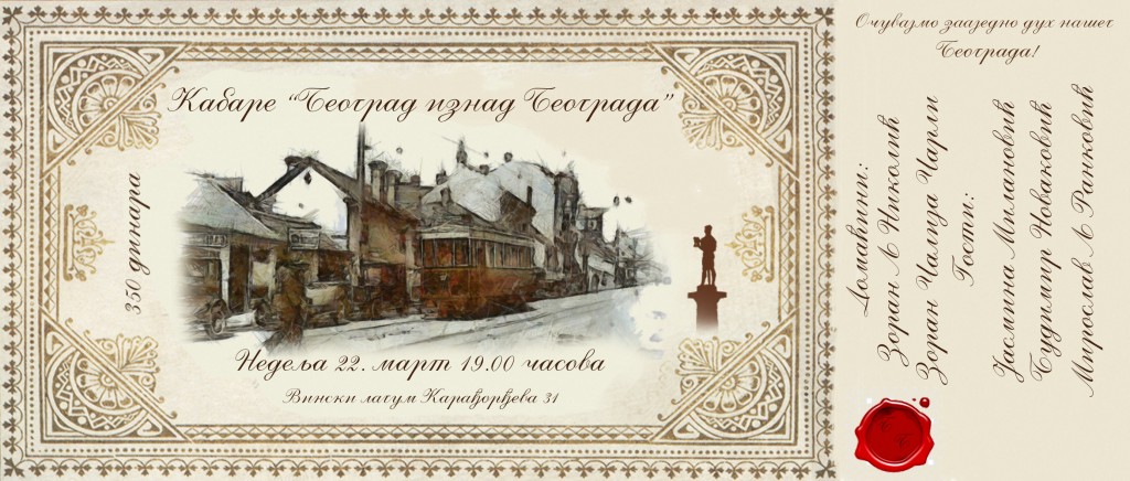 Konferansijer Zoran Lj Nikolić pisac, pesnik, novinar, publicista, turistički vodič i pustolov je maestralno obavio svoj zadatak vodeći svoje goste i goste kabarea kroz istoriju putem radosti i smeha. Za muziku je bio zadužen Zoran Čalija Čarli, akademski slikar i pedagog koji je spojen sa usnom harmonikom i gitarom proizvodio zvuk dostojan Zvezdanih noći sa čuvenog malog Kalemegdana. Budimir Novaković arhitekta i pisac svojim pričama o „Kobasicama koje su plesale“ i Miroslav Lj Ranković slikar i pisac ovdašnji sa svojim recitalima satirične poezije izazivali su minute smeha iz srca posetilaca prepunog laguma. Iznenađenje Kabarea predstavljala je dama anđeoskog glasa Jasmina Milanović koja je publiku najpre ostavljala bez daha a kasnije uvodila u horsko pevanje. Poseban užitak predstavljala je šetnja kroz protekle decenije i krajolike u kojima su pesme nastajale. Bis je naravno bio nužan a radost Nikolić Lj Zorana i ostalih učesnika neizmerna. Jasmina je član divnog ansambla „Niska od bisera“ i osim pevačkog dara publici pruža i jedinstven scenski pokret.Provod sa nasmejanim gostima ispunjenih duša i razlivenih emocija iz srca ostao je u sećanju svakog posetioca. Zbog prirode gostiju i nužne interakcije sa publikom scenario ne postoji pa se ni samo trajanje ne može predvideti. Završava se plesom i čarolijom koja šank laguma pretvara u knjižaru i galeriju učesnika programa i još jednu priliku da sa sobom ponesu knjige i slike proizašle direktno iz srca Konferansijea i njegovih gostiju. Još jedna potvrda da je umetnički izraz nužan, voljen i moćan da se sjedini izvođače sa publikom, umetnike sa umetnicima i trenutak sa srećom.