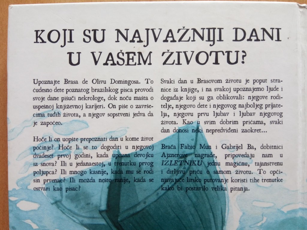 O, da li smo, druže, samo izletnici u ovom svetu…? – Mogli bismo onako, kolovijalno u nekom zanosu, da postavimo to pitanje, razmišljajući o prolaznosti života, koliko toga stvarno doživljavamo i proživljavamo, šta ćemo postići i kakav ćemo trag ostaviti… U vremenskom okviru koji nam je dat, možda baš zvuči indikativno naslov na engleskiom pod kojim je ovo delo poznato; Daytripper, pri čemu prvi deo složenice sugeriše neki element kratkotrajnosti. Ovo ostvarenje Gabrijela Ba i Fabija Muna (dobro, ne zanemarimo ni koloristu Dejva Stjuarta) začinjeno je, naročito na kraju, brojnim skicama, vinjetama, raznim zapisanim mislima, što sve ‘organski’ možda i ne spada u samu priču, ali doprinose nekom osećaju životnosti, dočaravanju senzilibiiteta i razvoja kreativnih momenata. Odabir imena protagoniste možda neće delovati tako značajno i simbolički nekom auditorijumu na ovim prostorima, ali evo evo, kad se malo protumači, može se reći da malo podseća na sam naziv Brazil, ali pre če biti da upućuje na ime Bras Kubas (Cubas) koje je nosio portugalski istraživač iz 16. veka, koji se naravno, dotakao i Brazila (ha, i to je neki izletnik u daljine!) ali isto ime je nosio i junak romana iz 19. veka, sa intrigantnim nazivom Posmrtni memoari Brasa Kubasa, od Mačada de Asisa – eto, opet neko balansiranje između pojmova života i smrti, prosto sa nekim metafizičkim asocijacijama…?