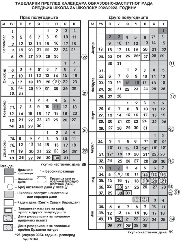 Kalendar za školsku 2022/23. godinu je objavilo Ministarstvo prosvete, nauke i tehnološkog razvoja, posebno za osnovne, a posebno i za srednje škole.