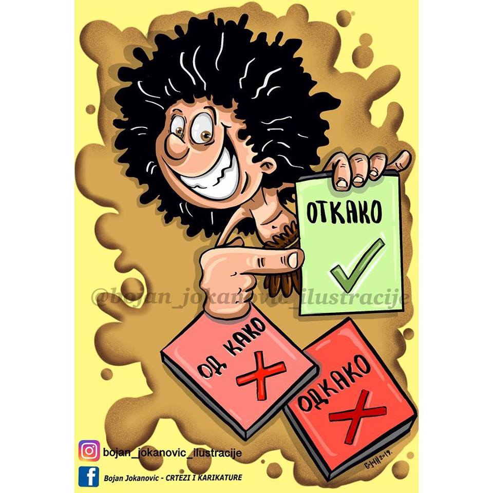 Karikatura: Bojan Jokanović apr 24, 2019 Karikatura dana Od kako ili otkako? Piše se otkako. Prilog otkako koji znači od onog časa, trenutka kad, otkad, piše se spojeno. 😀 Karikatura: Bojan Jokanović ključne rečiKarikatura danaKarikature Bojana Jokanovića FacebookTwitterEmailViberReddItWhatsAppTelegramPrintPinterestTumblrLinkedinMixVKDiggLINENaver Facebook Prethodni tekstDragi prosvetni radnici, ovaj tekst može da uvredi samo one koji su se u njemu pronašliSledeći tekstLaboratorija zvuka: Poletarac Bojan JokanovićRođen 2. maja 1985. godine u Tuzli, živi u Doboju. Diplomirani Teolog, radi kao vjeroučitelj. Bavi se crtanjem, sviranjem gitare…"satiričnim" temama iz svakodnevnog života, ne/kulture, obrazovanja, mentaliteta...Čovek pre svega. PROČITAJTE! Knjige Petar Pismestrović: Partija pokera – knjiga karikatura Petar Pismestrović - dec 4, 2025 Satatatira Karikatura dana Petar Pismestrović - avg 13, 2025 Satatatira Karikatura dana Petar Pismestrović - avg 13, 2025 Zanimljivosti Misao dana Prvoslavka Marković - jan 28, 2018 Magazin Moleban za zdravlje i blagostanje Prestolonaslednika na njegov 80. rođendan Zoran Todorović - jul 17, 2025 Satatatira Dnevna doza aforizma Nenad Maksimović - feb 18, 2016 Mesečina Đorđe Maksimović – Skupa želja II dio Đorđe Maksimović - jan 12, 2019 Zanimljivosti Gospodin Profesor ima reč, a mi aplauz za njega! Zoran Todorović - jul 3, 2018 Mesečina Stefan Simić: *** Stefan Simić - dec 29, 2017 Strip Ti uzbudljivi klinci: Opet malo Titef Mišo Koprivica - dec 18, 2018 Satatatira Dnevna doza aforizma Nada Kljajić - apr 9, 2016 Otvorena vrata Novakova poruka sinu Stefanu/VIDEO/ Zoran Todorović - feb 1, 2016 Otvorena vrata Likovni rad dana: Neobično biće Jovanka Ignjatović - nov 19, 2016 Strip Strip revija Večernjeg lista br. 53 Zoran Todorović - feb 4, 2018 Satatatira Aforizmi Ismet Salihbegović Deana Sailović - okt 27, 2017