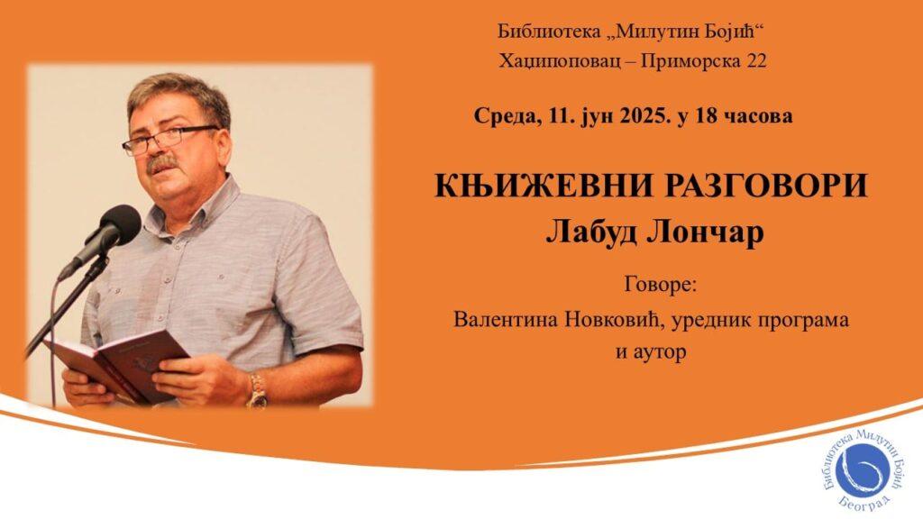 Biblioteka „Milutin Bojić“, Hadžipopovac – Primorska 22 u Beogradu organizuje književnu trivinu „KNJIŽEVNI RAZGOVORI“ sa Labudom N. Lončarom. Književnikom, predsjednikom Međunarodnog udruženja književnih stvaralaca i umjetnika Nekazano iz Bara, sreda, 11. jun 2025. u 18 časova.