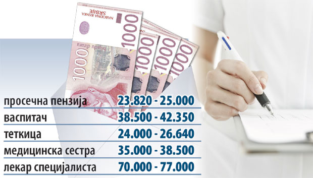 Tako će lekar specijalista umesto prosečnih 70.000 dinara primiti oko 7.000 više, medicinska sestra gotovo 3.500 više, koverta vaspitača biće “deblja” za blizu 4.000, “tetkice” u školi za 2.500, dok će prosečni penzionerski ček biti povećan za 1.200 dinara.