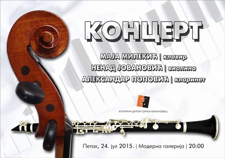 Mladi srpski umetnici: Nenad Jovanović, violina, Maja Milekić, klavir i Aleksandar Popović, klarinet, na poziv Kulturnog centra, u petak, 24. jula održaće koncert u Modernoj galeriji.