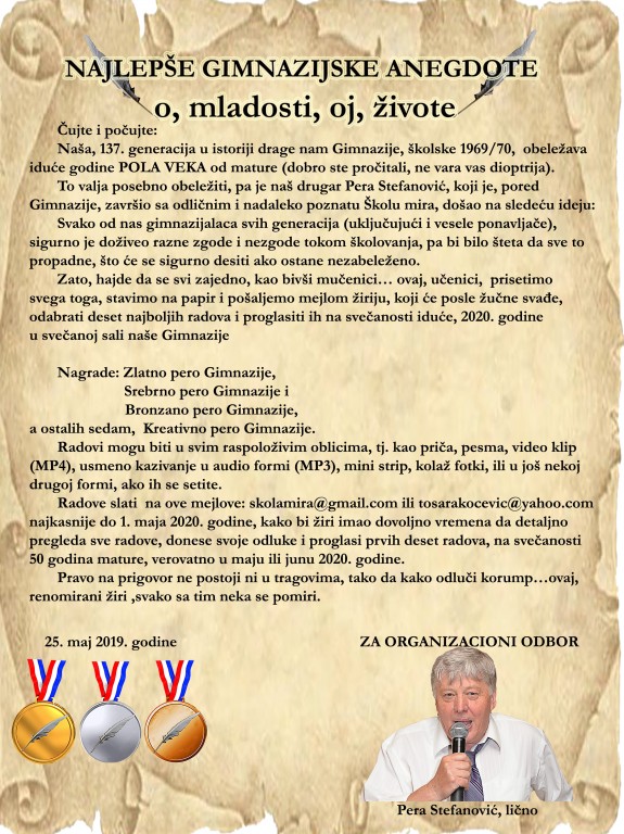 jun 1, 2019 Konkurs: Najlepše anegdote PRVE KRAGUJEVAČKE GIMNAZIJE Pozivamo da budete ucesnik KONKURSA ZA NAJLEPŠE ANEGDOTE PRVE KRAGUJEVAČKE GIMNAZIJE ! Namenjeno bivšim i sadašnjim gimnazijalcima, prosvetnim i drugim radnicima, svima onima kojima Gimnazija nešto znači… ključne rečiKonkurs: Najlepše anegdote PRVE KRAGUJEVAČKE GIMNAZIJE FacebookTwitterEmailViberReddItWhatsAppTelegramPrintPinterestTumblrLinkedinMixVKDiggLINENaver Facebook Prethodni tekstNikkka Quintet – “ Moje milo Banaćanče „Sledeći tekstAtelje Marine Veselinović Miloš IgnjatovićPriređivač Šumadijskog ateljea. Fotoreporter ,,Blica'', ,,LID-'a'', ,,Sportskog žurnala'', ,,Svetlosti'', ,,KG novina'', ,,Politike''. PROČITAJTE! Obrazovanje Srpski đaci doneli četiri medalje sa informatičke olimpijade u Bukureštu Zoran Todorović - dec 5, 2025 Knjige Ljubav, stihovi i prijateljstvo u „Itaka Library Bar“-u Zoran Todorović - dec 5, 2025 Atelje Veče sećanja i prateća izložba „Koreni i krila“ u Kraljevskom dvoru Zoran Todorović - dec 5, 2025 Muzika Meghan Trainor lips are moving/drum cover/ Leo Fabijančić Zoran Todorović - jun 4, 2016 Mesečina Srećko Aleksić: Mogao bih Srećko Aleksić - feb 2, 2022 Fotografija Fotografija dana Marko Marković - feb 25, 2018 Fotografija Arsenal fest 2023 – Parov Stelar Miloš Ignjatović - jul 3, 2023 Priključenija Konkurs za kratki strip “KRAGUJEVAČKI POBEDNIK“ 2016. Svet stripa - jun 15, 2016 Knjige Milica Jovanović, nova „Zaljubljena zvezda“ na nebu poezije Zoran Todorović - feb 24, 2023 Otvorena vrata Likovni rad dana: Deda Mraz od kartona Jovanka Ignjatović - maj 24, 2017 Zanimljivosti Vic dana: Sedo pivo Đorđe Todorović - dec 19, 2018 Otvorena vrata Likovni rad dana: Pepeljuga – ilustracija Jovanka Ignjatović - jan 19, 2016 Zanimljivosti Aforizam dana Predrag - Peđa Đakonović - avg 2, 2015 Satatatira Karikatura dana Slaviša Ševrt - dec 21, 2018 Zanimljivosti Na današnji dan: 13 maj Zoran Todorović - maj 13, 2019
