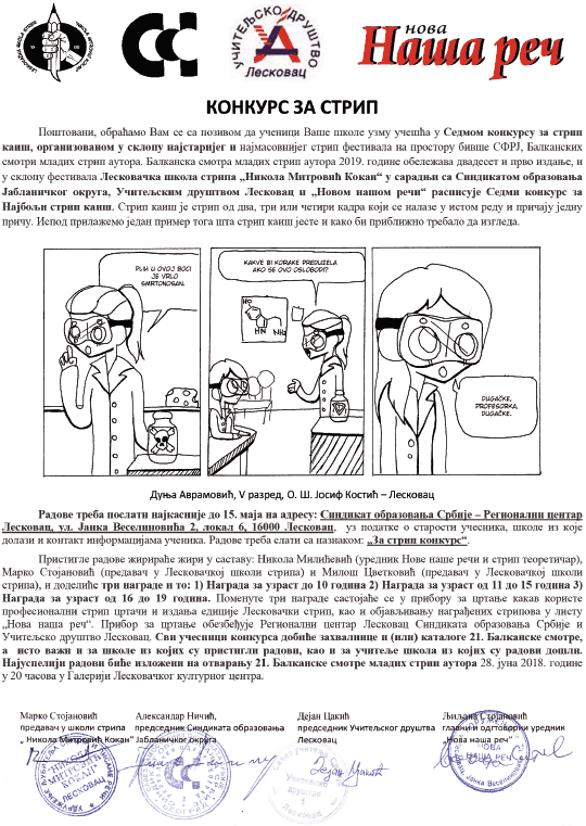 Poštovani, obraćamo Vam se sa pozivom da učenici Vaše škole uzmu učešća u Sedmom konkursu za strip kaiš, organizovanom u sklopu najstarijeg i najmasovnijeg strip festivala na prostoru bivše SFRJ, Balkanskih smotri mladih strip autora. Balkanska smotra mladih strip autora 2019. godine obeležava dvadeset i prvo izdanje, i u sklopu festivala Leskovačka škola stripa „Nikola Mitrović Kokan“ u saradnji sa Sindikatom obrazovanja Jablaničkog okruga, Učitelјskim društvom Leskovac i „Novom našom reči“ raspisuje Sedmi konkurs za Najbolјi strip kaiš. Strip kaiš je strip od dva, tri ili četiri kadra koji se nalaze u istom redu i pričaju jednu priču. Ispod prilažemo jedan primer toga šta strip kaiš jeste i kako bi približno trebalo da izgleda.