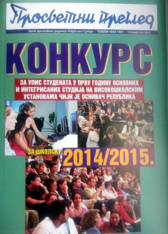 U izdanju Prosvetnog pregleda izašao je iz štampe „Konkurs za upis studenata u prvu godinu osnovnih i integrisanih studija na visokoškolskim ustanovama čiji je osnivač Republika za školsku 2014/2015. godinu“.Konkurs se može kupiti u knjižari „Prosvetnog pregleda“ u Beogradu, ulica Dečanska br. 6, kao i u svim knjižarama koje prodaju izdanja „Prosvetnog pregleda“. Primerci Konkursa se mogu naručiti u redakciji „Prosvetnog pregleda“, na telefone: 011/ 32 35 378 i 011/ 32 39 096 kao i preko elektronske adrese: kontakt@prosvetni/pregled.rs.