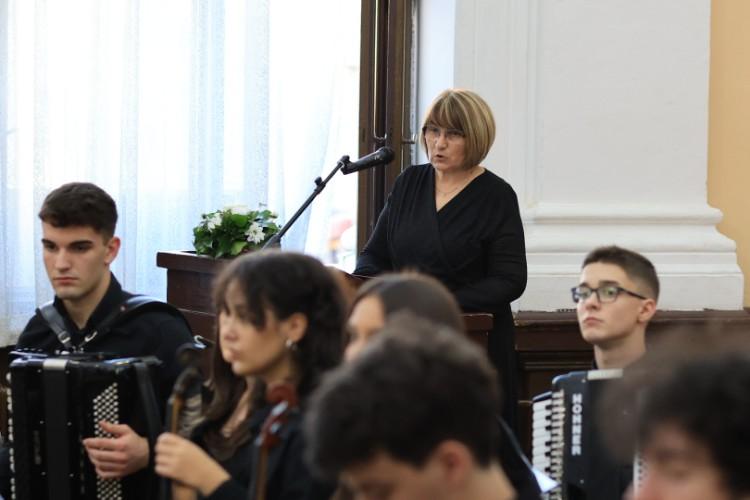 Oktobarski mrak ne možemo lako rasterati, ali zato težimo da znanjem savladamo ideje rata i zla. Pričom o prošlosti, slikajući stihovima kragujevački oktobar, pominjući imena stradalih kako bi nam ostali bliži, pokušajmo da uselimo mudrost mira u svaku ljudsku dušu koja šeta ovim prostorima. Danas će o njima, ali i umesto njih govoriti ovi novi dečaci i devojčice koji sada uče pod krovom ovog zdanja – kazala je Slavica Marković, direktorka Prve kragujevačke gimnazije.