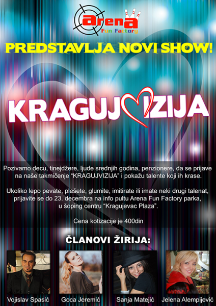 Prvi put u našem gradu održaće se takmičenje pod nazivom “KRAGUJVIZIJA” koje će, nadamo se, postati tradicionalno. 27.12.2016. održaće se PRVI KRUG TAKMIČENJA za koje se možete prijaviti upravo do tog dana. Cena kotizacije je 400 dinara.