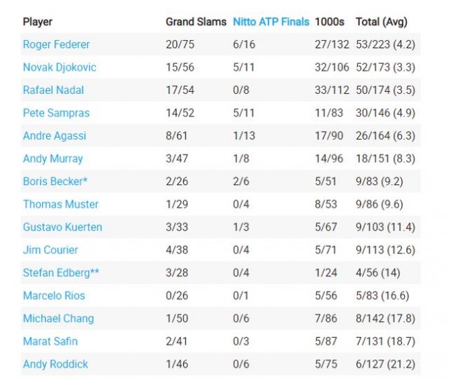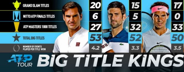 Đoković je do 52 ttiule stigao na 173 nastupa na takozvanim „mejdžorima“ što znači da osvaja trofej na svaka 3,3, dok je Federer svoje 53 uzeo na 223 velika turnira što je titula na svaka 4,2. Trećeplasirani nadal ima 50 na 174, pa je njegov prosek 3,5.