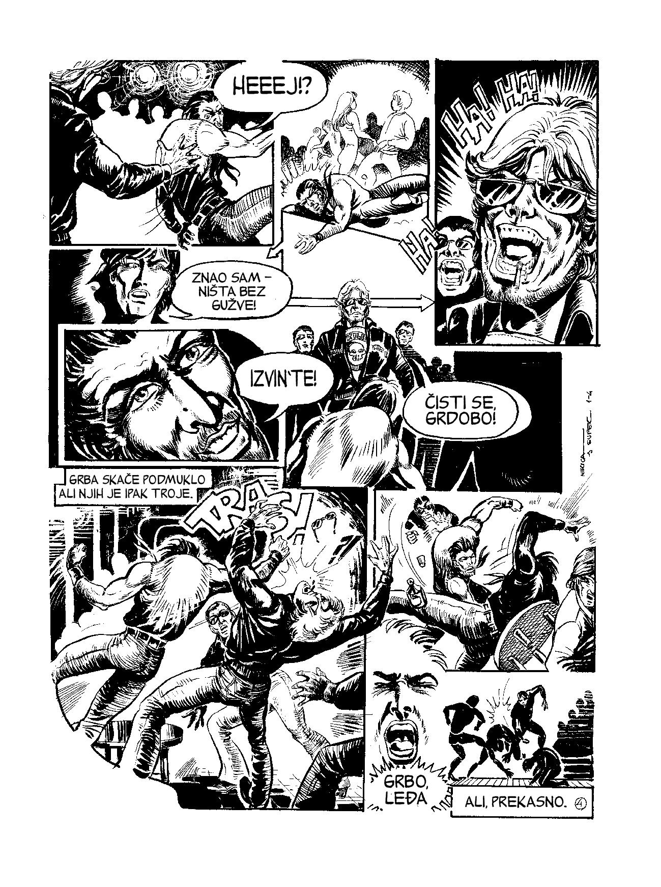 Vredi naglasiti da je ovo jedina saradnja Supeka i Mikice, jednog vrlo atipičnog umetnika i jednog žestoko efikasnog zanatlije. Ovo delo od šesnaest tabli donosi jednu vinjetu, smeštenu u Odžacima, o seriji događaja jedne vrlo verovatno prosečne večeri. Veliki deo ove priče je periferalnost. Glavni likovi, imenima Grba, Keka i Š-Š, su glavni u onom najpovršnijem smislu; drugim rečima, iako su glavni likovi, nisu glavni akteri. Cela radnja se odvija oko njih, ali priča kao da ne zavisi od njihovih akcija. Primera radi, glavna konfrontacija Grbe (najprominentnijem od ovo troje) je sa nasumičnim likovima u klubu pri početku stripa, a ona koja bi trebala da bude glavna (sučeljavanje sa Mikicom, momkom koji se zabavlja sa curom u koju je Grba zaljubljen) se ne ostvaruje. Onda taj Mikica i njegova cura Marina; oboje deluju kao arhetipski „glavni lik i devojka istog“, što je naglašeno njenom zaslepljujućom lepotom i vitkom figurom, a njegovim znanjem karatea i junačkim zaustavljanjem kriminalaca na ulici. On bi u stripu trebalo da bude neki tip negativca, ali je samo periferno negativac – iako se Grba kači sa njim, ne dolazi do tuče ili preokreta. Štaviše, Mikica se zalaže za Grbu da nije lopov kada policajci sumnjaju na njega. Ovo se nadovezuje na Grbinu periferalnost pomenutu ranije u tekstu. Tu Mikicinu konfrontaciju sa krimosima gleda iz prikrajka, sakriven, čak zadovoljan kada Mikica popije poneki udarac. Keka i Š-Š, na primer, nemaju nešto preterano razvijene ličnosti. Oboje su kao podrška i moralni kompas za Grbu, a opet deluju arhetipski kao glavni junaci neke prizemnije priče (tipa prosečan momak i devojka iz kraja), za razliku od Mikice i Marine, koji deluju kao Kerčev Kobra i Diznijeva princeza (umetnuti bilo koju po izboru).