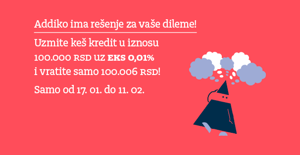Addiko banka nudi kredit sa kamatom 0,01 odsto. Za iznos kredita od 100.000 dinara, posle 12 meseci, klijent vraća banci samo 100.006 dinara. Dakle samo 6 dinara.