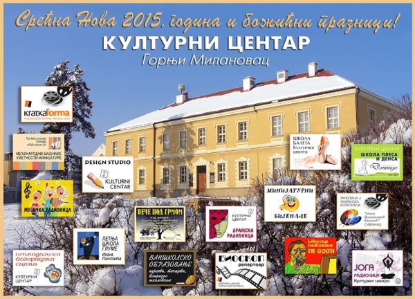 jan 3, 2015 Kulturni centar/ Gornji Milanovac ključne rečičestitkaGornji MilanovacKULTURNI CENTAR FacebookTwitterEmailViberReddItWhatsAppTelegramPrintPinterestTumblrLinkedinMixVKDiggLINENaver Facebook Prethodni tekstLaku noćSledeći tekstTvit dana KULTURNI CENTAR GORNjI MILANOVACUstanova za kulturu, umetnost i vanškolsko obrazovanje PROČITAJTE! Atelje Veče sećanja i prateća izložba „Koreni i krila“ u Kraljevskom dvoru Zoran Todorović - dec 5, 2025 Kultura „Umetnički horizont“ raspisuje konkurs za pesnike Mićković Saša - dec 3, 2025 Film Održana premijera dokumentarca “Od izgnanstva do povratka“ o Prestolonaslednikovom životu Zoran Todorović - nov 30, 2025 Mesečina Spomenka Denda Hamović: UPLOVI Spomenka Denda Hamović - avg 12, 2016 Vesti Objavljen četvrti broj časopisa za umetnost i kulturu „Zvezdani Kolodvor“ Zorica Tijanić - dec 16, 2015 Otvorena vrata EUROBOT nacionalno takmičenje u robotici početkom aprila u Novom Sadu Zoran Todorović - mar 31, 2019 Mesečina Dijana Uherek Stevanović: Traganje u iluziji Dijana Uherek Stevanović - jan 28, 2020 Otvorena vrata Liste spoljnih saradnika Zavoda za unapređivanje obrazovanja i vaspitanja Zoran Todorović - feb 9, 2018 Zanimljivosti Za miran san i dobar dan: Miki Maus S1E6 Đorđe Todorović - apr 18, 2017 Satatatira Karikatura dana, meseca, godine: Žarko Laušević Petar Pismestrović - nov 18, 2023 Magazin Zdravlje i lepota: Koja je hrana dobra za jetru? Ema Vitković - avg 22, 2022 Priključenija Olimpijski komitet Srbije: Odbojkaška reprezentacija je najuspešniji ženski tim Srbije u 2021. godini Zoran Todorović - dec 26, 2021 Satatatira Milko Stojković aforizmi Deana Sailović - maj 9, 2017 Otvorena vrata Za znanje bez muke – igrom u prirodne nauke Jovanka Ignjatović - sep 13, 2014 Magazin Još jedno svetsko prvenstvo u Mokrinu, kako otkriti najtvrđe jaje Zoran Todorović - maj 8, 2024