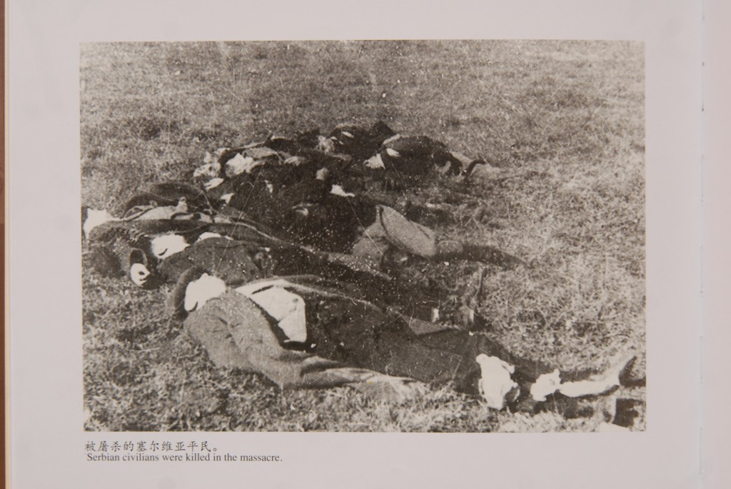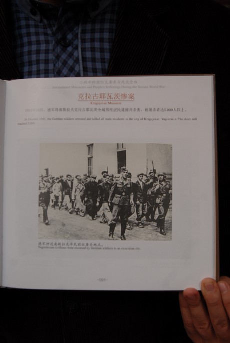 Интерсантно је напоменути да књига која се бави интернационалним ратним масакрима помиње и злочин у Крагујевцу из 1941. године где стоји да је стрељано 5 000 становника Крагујевца. Књига преживелих људи из тог доба илустрована је фотографијама и илустрацијама најпознатијих уметника Кине. Књига споменика у њиховом комплексу који се налази унутар града илустрован је само цртежима.