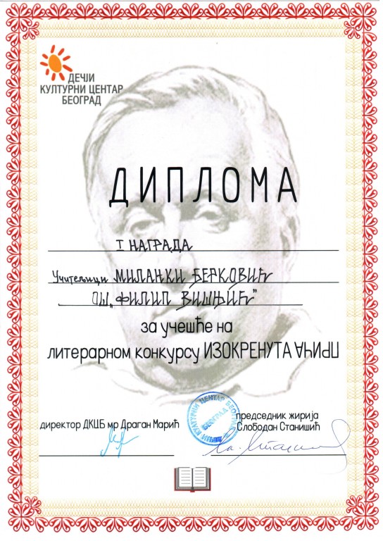 Dodela diploma za literarni konkurs “Izokrenuta priča“ održana je 20. januara u Dečjem kulturnom centru Beograd. Diplome su dobili nagrađeni učenici i njihovi učitelji od Slobodana Stanišića, književika za decu i predsednika žirija, u prisustvu Leontine Vukomanović, zamenika direktora DKC i Vesne Krnjaić Mitrović, stručnog saradnika za edukativne programe.