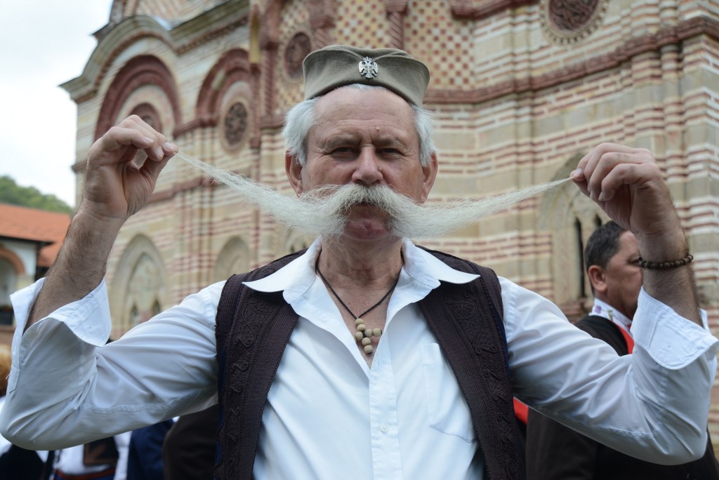 Ljubo Brko iz sela Trske u porti manastira Kalenić razvukao svoje adute za naj brkove na 52. saboru PROĐOH LEVAČ PROĐOH ŠUMADIJU.