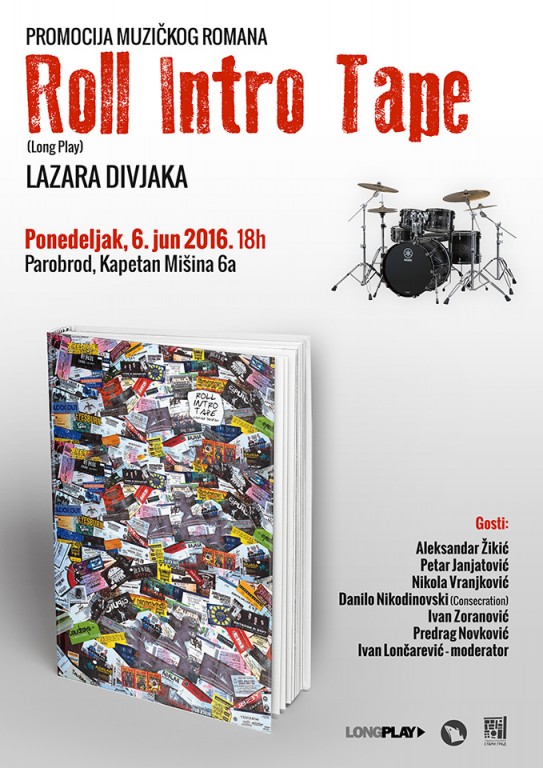 Beogradska promocija muzičkog romana Lazara Divjaka „Roll Intro Tape“ – prve knjige u izdanju promoterske kuće Long Play – biće održana u ponedeljak 6. juna od 18.00 u Ustanovi kulture „Parobrod“ (Kapetan Mišina 6a).