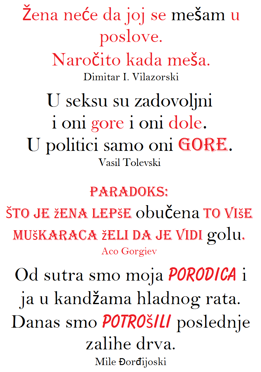 Made in Makedonija okt 11, 2017 Made in Makedonija Made in Makedonija FacebookTwitterEmailViberReddItWhatsAppTelegramPrintPinterestTumblrLinkedinMixVKDiggLINENaver Facebook Prethodni tekstPriča o Galipoljskim Srbima: Nakon 4 veka stradanja ostalo ih svega 12-oro, a izjašnjavaju se kao Makedonci nakon SFRJSledeći tekstVeliki jesenji horoskop za 2017. godinu Made in MacedoniaUrednici rubrike Vitomir Dolinski i Deana Sailović PROČITAJTE! Knjige Petar Pismestrović: Partija pokera – knjiga karikatura Petar Pismestrović - dec 4, 2025 Satatatira Karikatura dana Petar Pismestrović - avg 13, 2025 Satatatira Karikatura dana Petar Pismestrović - avg 13, 2025 Otvorena vrata Četiri godine školskog života su iza nas Zoran Todorović - jul 9, 2014 Magazin Olga Tomović: Vlati Olga Tomović - avg 24, 2018 Fotografija Fotgrafija dana Marko Marković - jul 30, 2017 Satatatira Karikatura dana Tode Blaževski - jun 1, 2019 Muzika Najbolja mlada frulašica Srbije: Kad Neda zasvira frulu nastaje čarolija Zoran Todorović - okt 5, 2017 Zanimljivosti Tvit dana Kristina Raković - jan 22, 2015 Mesečina Stanković R. Slavica Šibalić: Niska bisera Slavica R. Šibalić - mar 22, 2018 Otvorena vrata Zašto Vaš tinejdžer neće da priča sa Vama? Zoran Todorović - jun 1, 2017 Satatatira Dnevna doza aforizma Mitar Đerić - okt 31, 2017 Mesečina Zoran Todrorović: Imam 50 i nije me stid Zoran Todorović - jun 8, 2022 Zanimljivosti Da ne poveruješ: Najmlađe Đorđe Todorović - dec 28, 2015 Mesečina Dnevna doza aforizma Salja P. Slovenski - dec 1, 2015