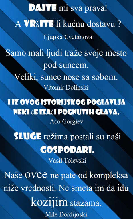 jun 7, 2017 Made IN Makedonija FacebookTwitterEmailViberReddItWhatsAppTelegramPrintPinterestTumblrLinkedinMixVKDiggLINENaver Facebook Prethodni tekstRoditeljski “biseri” upućeni vaspitačicamaSledeći tekstLepota i zdravlje: Kako se nose crvene pantalone Made in MacedoniaUrednici rubrike Vitomir Dolinski i Deana Sailović PROČITAJTE! Knjige Petar Pismestrović: Partija pokera – knjiga karikatura Petar Pismestrović - dec 4, 2025 Satatatira Karikatura dana Petar Pismestrović - avg 13, 2025 Satatatira Karikatura dana Petar Pismestrović - avg 13, 2025 Zanimljivosti Subotom od Janka vic bez prestanka Janko R. Milenković - okt 5, 2019 Priključenija Novak srušio Berdiha, za 50. titulu u karijeri protiv Federera! Zoran Todorović - feb 27, 2015 Kultura Nišville volonterski tim – prijavi se Zoran Todorović - jun 1, 2018 Knjige Henrik Sjenkjevič: „Kroz pustinju i prašumu“ Mišo Koprivica - jul 21, 2016 Strip Sport, turizam i mračni poslovi u kalifatu i oko njega Zoran Todorović - dec 4, 2017 Zanimljivosti Da li ste znali: Dlake Zoran Todorović - jun 19, 2014 Satatatira Satiričarenje Matija Bećković Deana Sailović - avg 25, 2017 Atelje Драгомирцу из Добраче – Гран при Тријенала Miloš Ignjatović - nov 1, 2016 Otvorena vrata Javni poziv za obrazovanje liste spoljnih saradnika Zavoda za unapređivanje obrazovanja i vaspitanja Zoran Todorović - jan 21, 2018 Magazin Прва српска штампана књига Predrag Kisa Kisić - jan 21, 2019 Mesečina Tanja Radivojević: Prinče moj Tanja Radivojević - okt 11, 2024 Satatatira Dnevna doza aforizma Srđan Simeunović Sendan - jan 16, 2017