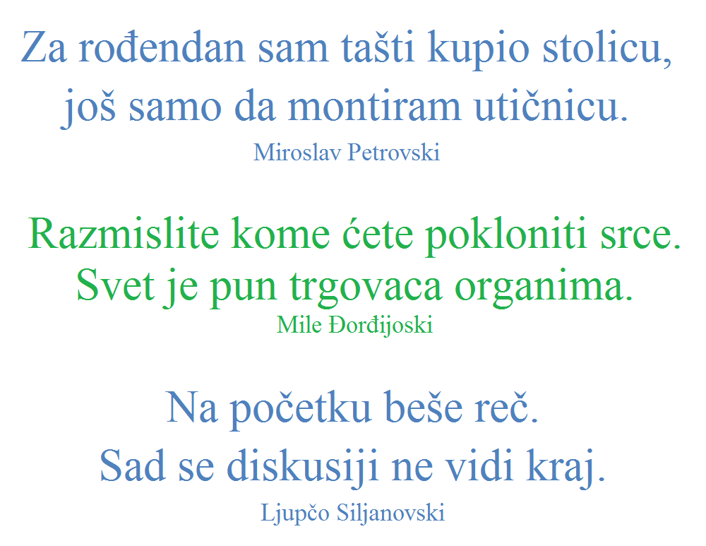 avg 30, 2017 Made IN Makedonija FacebookTwitterEmailViberReddItWhatsAppTelegramPrintPinterestTumblrLinkedinMixVKDiggLINENaver Facebook Prethodni tekstLikovni rad dana: Prva ljubav- ilustracija tekstaSledeći tekstJelena, žena koje nema – Andrićeve najlepše reči o ženi Made in MacedoniaUrednici rubrike Vitomir Dolinski i Deana Sailović PROČITAJTE! Satatatira Karikatura dana Petar Pismestrović - dec 6, 2025 Knjige Petar Pismestrović: Partija pokera – knjiga karikatura Petar Pismestrović - dec 4, 2025 Satatatira Karikatura dana Petar Pismestrović - avg 13, 2025 Otvorena vrata Pet stvari koje mogu da naškode zdravlju deteta Zoran Todorović - avg 5, 2017 Fotografija Fotografija dana: Zvukovi Alpa Slađana Pantelić - jun 20, 2025 Otvorena vrata MALA MATURA: Koja pitanja su namučila male maturante Zoran Todorović - jun 19, 2018 Zanimljivosti Misao dana Prvoslavka Marković - feb 25, 2017 Satatatira Dnevna doza aforizama Igor Pavlović - feb 21, 2017 Zanimljivosti Tinejdžerka zaradila 260 hiljada funti na smišljanju imena Zoran Todorović - mar 22, 2019 Otvorena vrata Svetlana Mitić: SL-23001-XT Svetlana Mitić - jun 2, 2017 Strip Planeta stripa – Doprinos Japana (2) Mišo Koprivica - nov 24, 2015 Zanimljivosti Misao dana Prvoslavka Marković - dec 21, 2016 Zanimljivosti Misao dana Prvoslavka Marković - jan 24, 2018 Mesečina DRUGA MAJKA Tode Nikoletić - apr 5, 2015 Satatatira Dnevna doza aforizma Branka Milićević - dec 7, 2016