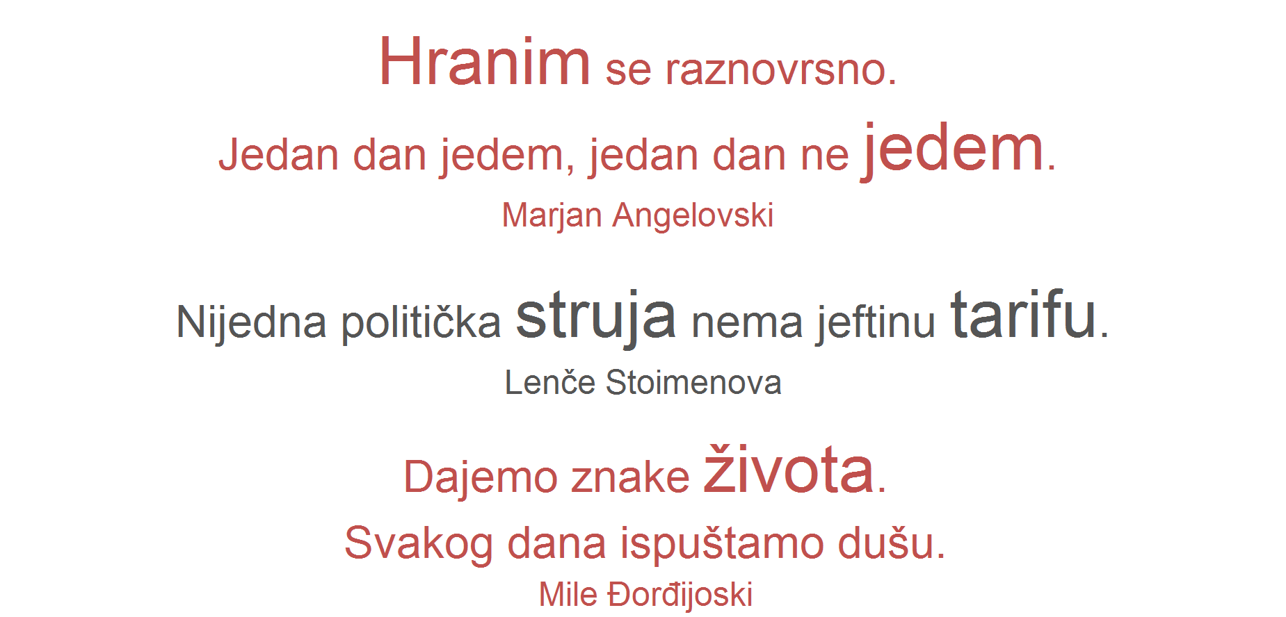 okt 4, 2017 Made IN Makedonija ključne rečiMade in. Makedonija FacebookTwitterEmailViberReddItWhatsAppTelegramPrintPinterestTumblrLinkedinMixVKDiggLINENaver Facebook Prethodni tekstNedeljni horoskop od 2. do 8. oktobra 2017.Sledeći tekstSlađana Nedeljković: Preci Made in MacedoniaUrednici rubrike Vitomir Dolinski i Deana Sailović PROČITAJTE! Knjige Petar Pismestrović: Partija pokera – knjiga karikatura Petar Pismestrović - dec 4, 2025 Satatatira Karikatura dana Petar Pismestrović - avg 13, 2025 Satatatira Karikatura dana Petar Pismestrović - avg 13, 2025 Fotografija Fotografija dana: Mir Labud Lončar - sep 8, 2017 Knjige Književna tribina „SLAVONSKA RAPSODIJA“ u TUZLI UDRUŽENjE BALKANSKIH UMETNIKA - mar 19, 2015 Mesečina Peko Laličić: Oglašavate se, budući Peko Laličić - jun 13, 2017 Priključenija Noletu ESPY nagrada za najboljeg tenisera! Zoran Todorović - jul 29, 2015 Pokazivač pokazuje Intervju: DARKO ĐURIĆ – Arena i Kusturica Emisija Dva komada nečega - nov 4, 2015 Priključenija Novak se vraća na teren u Montrealu Zoran Todorović - avg 6, 2015 Magazin Hemija strasti: Kako se, u koga i zašto zaljubljujemo? Zoran Todorović - avg 13, 2017 Satatatira Karikatura dana Goran Ćeličanin - sep 3, 2017 Mesečina Dušan Milijić, Glumica Dušan Milijić - jun 4, 2017 Mesečina Dišemo strahom Amra Kamberović - jan 31, 2016 Mesečina Lela Milosavljević: Bez ljubavi Lela Milosavljević - mar 8, 2025 Zanimljivosti Mozgalica nedelje (br. 97): Hirurg Zoran Todorović - jun 5, 2016