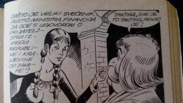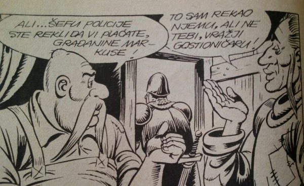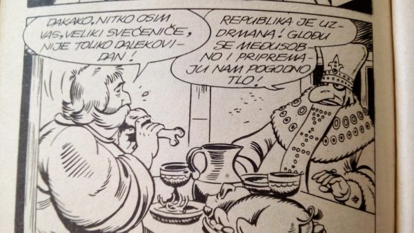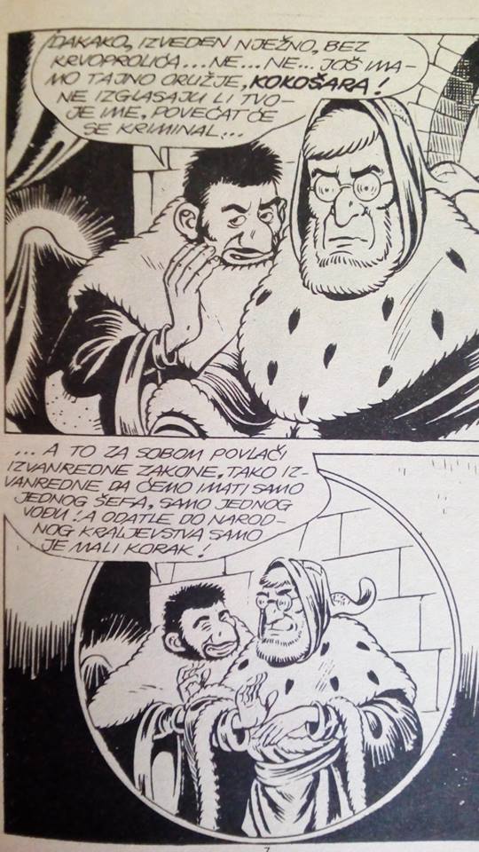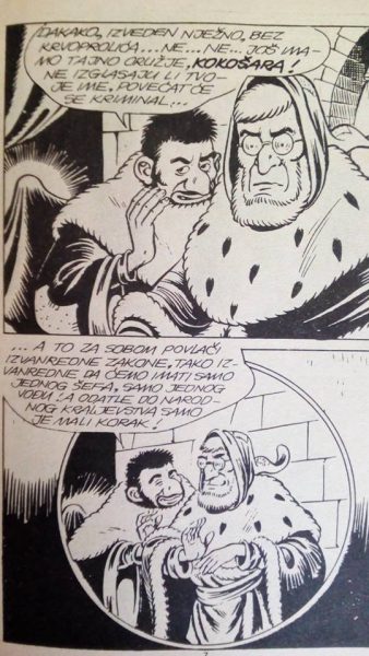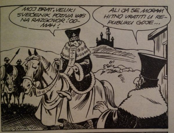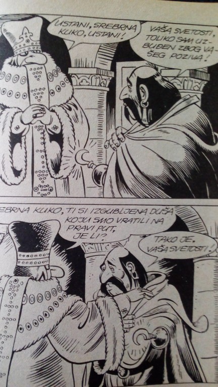 Zaista šta je bilo sa kraljem posle pobune? Sasvim ukratko, kraljevska porodica je oscilirala između gostoprimstva Kralja od Zakrpe i gostoprimstva Velikog sveštenika, ali više su se oslonili na ovog drugog – on je ubedio Maksmagnusa (rečima i raznim smicalicama) da prihvati njegovu pomoć za povratak na presto, s tim što će biti, hm, nešto smanjen uticaj svetovne vlasti – sad možemo naglasiti da Maksmagnus inače nije trpeo preveliki uticaj sveštenstva dok je bio na vlasti, i pored onog posla sa čudotvornim jezerom, te je bio prinuđen da mu se sad pokajnički obrati za pomoć (istorijski, mene lično je ovo malo asociralo dolazak cara Hajnriha IV kod pape u Kanosu ) E, sad zamislite – da malo pojasnimo, Kralj je zapravo potajno pošao po neko skriveni blago, ali ali su ga presreli zamaskirani pljačkaši – ni manje ni više nego krunisana glava poput Kralja od zakrpe, uz pomoć bivšeg Maksmagnusovog podanika, dvorskog nazovi-vrača Trombona! No, nije mnogo prošlo, oni su i sami postali žrtve prepada od strane snaga Velikog sveštenika, ostavši i bez konja! Posle toga, naravno, Maksmagnus ne nailazi na baš dobro raspoloženje i dobrodošlicu kod Kralja od Zakrpe, kome je inače prvo hteo da se obrati za pomoć, ali će zato veliki duhovni vođa biti i te kako motivisan da pod svojim uslovima pokrene odgovarajuću operaciju!