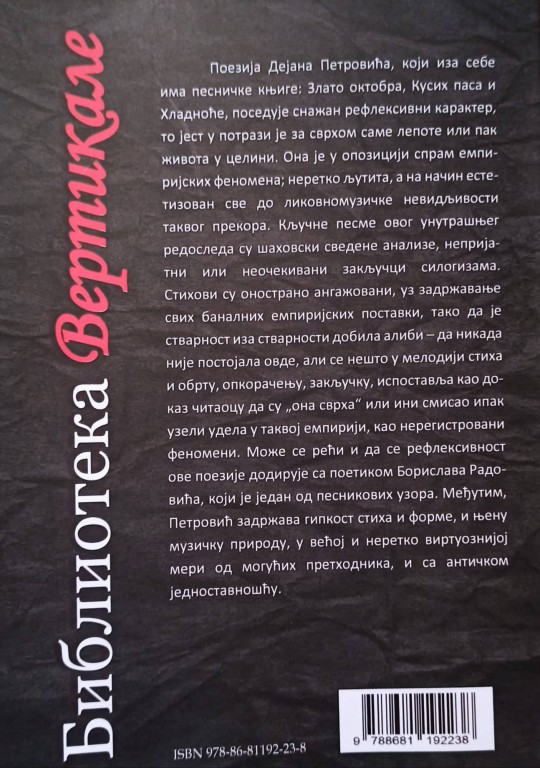 Povod razgovora sa Dejanom Petrovićem Kobajašijem je izlazak knjige pesama „PESME“, u izdanju „Udruženja nezavisnih pisaca Srbije“, Beograd (2020). U ovo izdanje, koje sadrži 69 pesama, uneto je 13 novih i jedna pesma iz knjige „ Zlato oktobra“ (2001). Knjiga „Hladnoće“ (2018) štampana je u celosti, tako da se, u suštini, radi o svojevrsnim Izabranim pesmama. U dnevnom listu „Politika“ svrstana je među deset najznačajnijih pesničkih knjiga u 2020. godini. Urednik izdanja je Ivan Despotović. I malo o književnim prilikama i neprilikama…