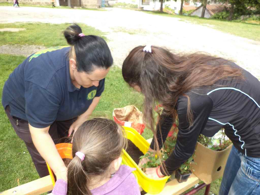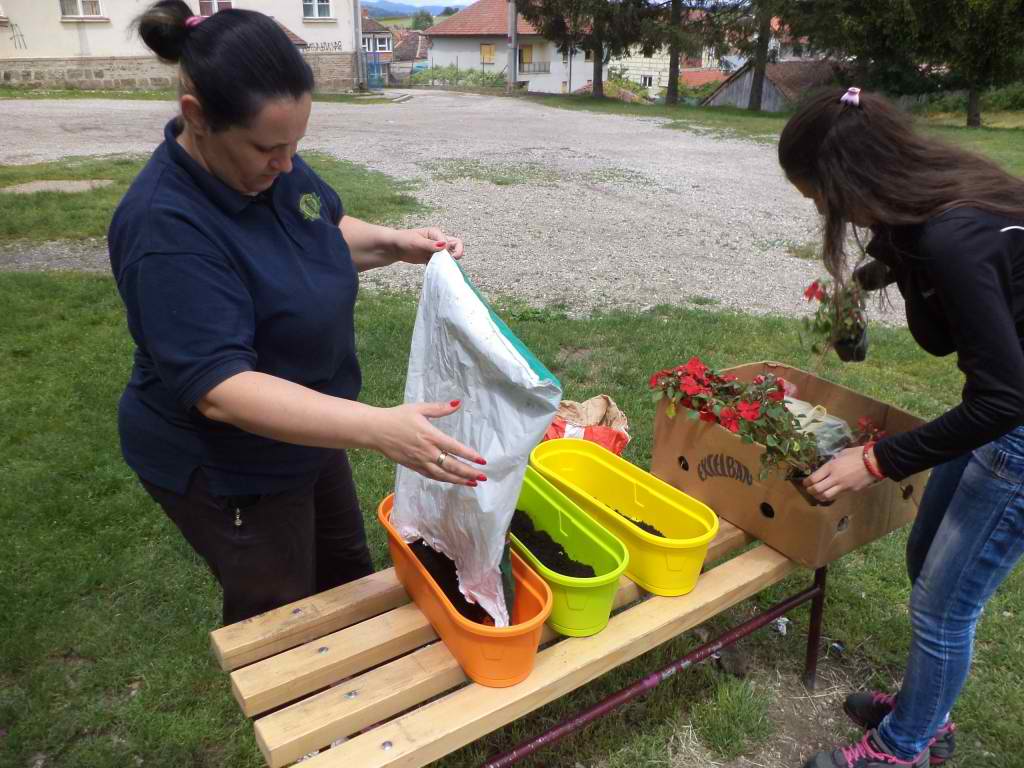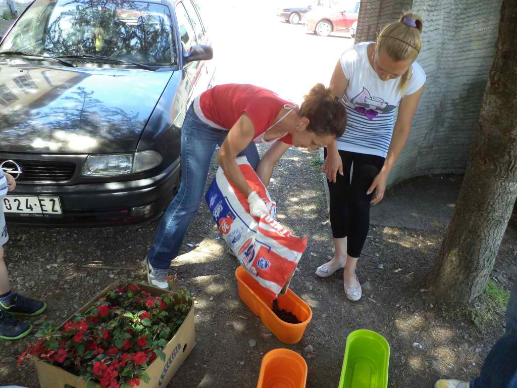 Njihovi drugari iz Školice života u Gruži bili su takođe vredni i motivisani za igru i rad u prirodi. Izrazili su želju da, zajedno sa svojim roditeljima i vaspitačicama, posade cveće kako bi oplemenili dvorište i prostorije hodnika koji koriste zajedno sa predškolcima. Kako je poznato da timski rad zagarantovano donosi uspeh, deca su odabrala žardinjere veselih boja, a zahvaljujući umeću svojih roditelja zasadili su cveće „lepog jovu“. Najmlađi su najviše radili, sa ushićenjem su pravili plan kako da rasporede cveće, uz mnogobrojna pitanja – kako, koliko, zašto, kako se zove, čemu služi… Naša drugarica Sofija je podelila sa nama svoje impresije: „I moja mama ima ovakvo cveće kod kuće i ja ga polivam i stalno mu pričam. Baka kaže ako pričaš cveću ono bolje raste!”