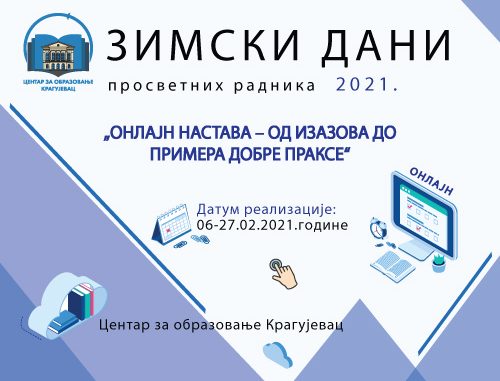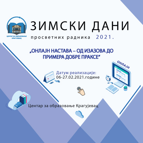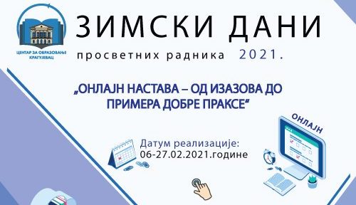 Organizaciona jedinica Centra za obrazovanje Kragujevac, Centar za stručno usavršavanje ove godine organizuje, dvanaestu po redu, manifistaciju „Zimski dani prosvetnih radnika“. Tema ovogodišnje manifestacije je „Onlajn nastava – od izazova do primera dobre prakse“ i, kao i prethodnih godina, pripremili smo preko deset aktivnosti za zaposlene u vaspitno-obrazovnim i obrazovno-vaspitnim ustanovama.