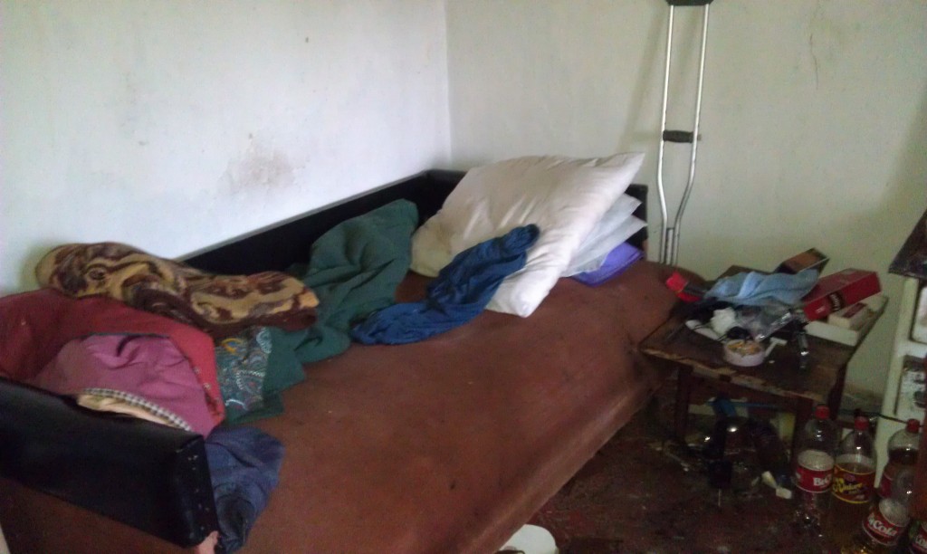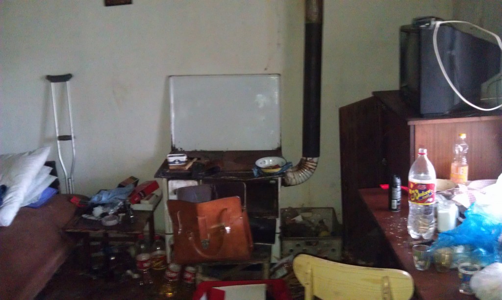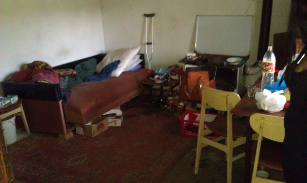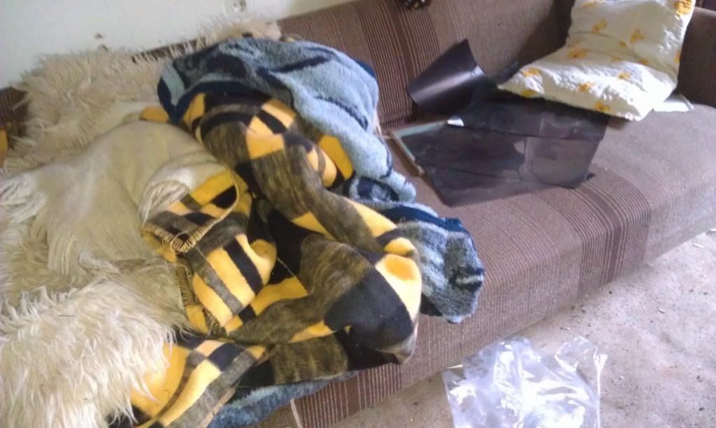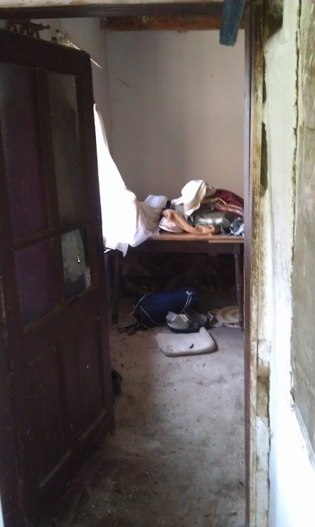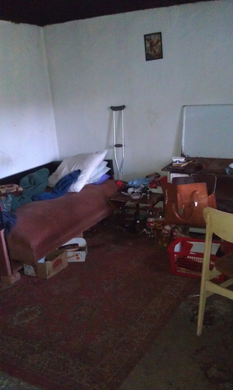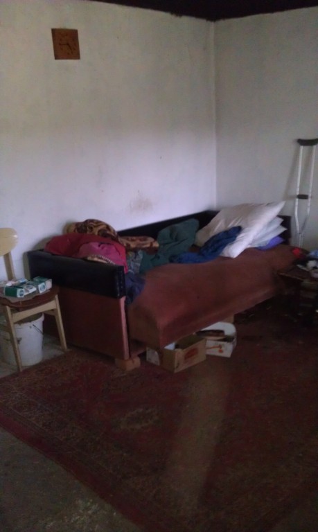 U trošnoj kući, krov koji prokišnjava, sa otvorenim tavanom od drvenih dasaka, dve sobe unutra televizor, krevet, regal i nešto od garderobe koju je dobio.