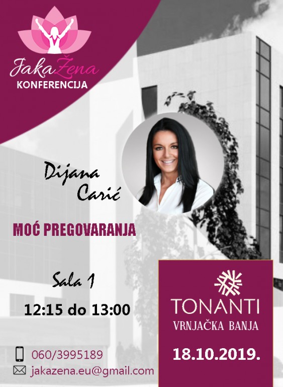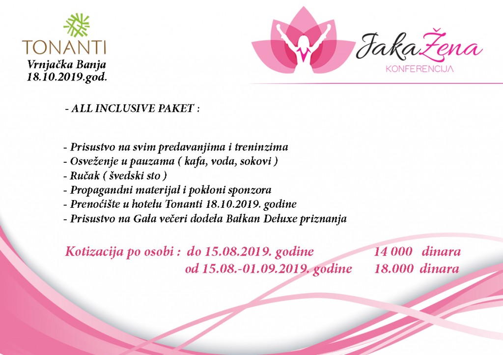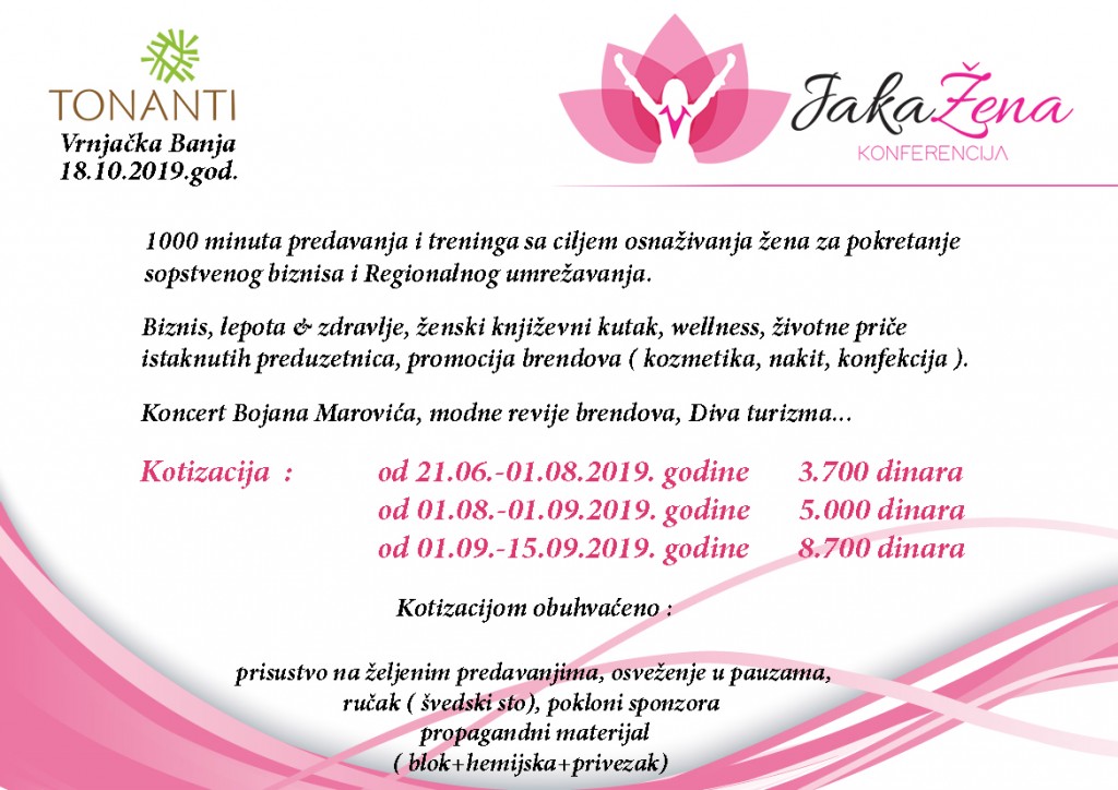 Konferencija JAKA ŽENA predstavlja događaj namenjen ženama iz privrednog, društvenog i javnog života, čiji će domaćin 18.oktobra 2019. godine biti najekskluzivniji hotel u Srbiji, prvi regionalni hotel sa 5+ zvezdica, TONANTI, Vrnjačka banja.