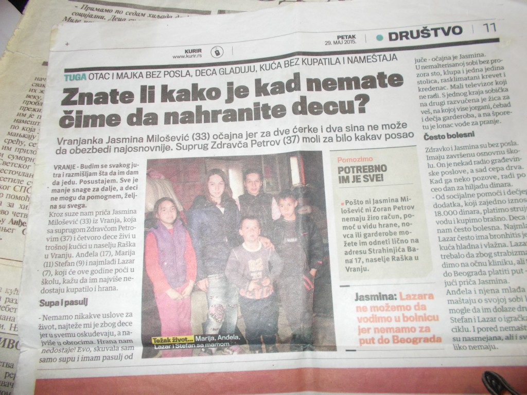 Ne znaju ni sami kako ce zimu izdržati, nemaju ni adekvatnu garderobu za hladne dane, najmlađi Lazar nosi pocepane patike pa zbog vlažnih nogu često se razboljeva. Nemoćna majka jedino što želi je da svojoj deci obezbedi krov nad glavom, jer zna kako biti siroče i kako je živeti u domu kroz šta je ona prošla. Sem ljubavi i radosti u domu ove porodice nedostaje bukvalno sve i zato pozivamo ljude dobre volje da im pomognu. Naše malo njima znači zaista mnogo.