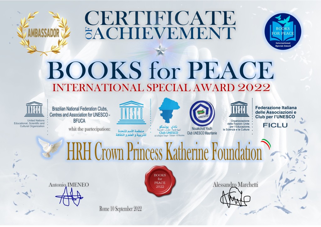 Beograd, 7. oktobar 2022. – NJ.К.V. Princeza Кatarina je veoma ponosna što je među laureatima koji su dobili međunarodnu nagradu „Кnjige za mir” za 2022. godinu, za svoj rad u korist kulture, solidarnosti i promocije ljudskih prava, društvenih aktivnosti i mira.