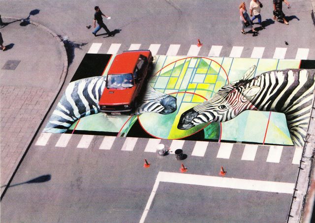 Miloje Mitrović slika zebre na asfaltu. Ne radi se o onim običnim “zebrama” preko kojih prelazite svakog dana. Njegove su prave umetničke slike sa motivima ovih prugastih životinja, ali istovremeno one predstavljaju i funkcionalne pešačke prelaze.