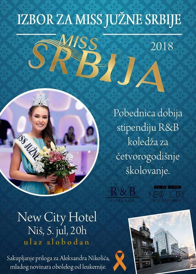 Izbor za Miss južne Srbije, inače drugo polufinalno takmičenje kompanije Izbora za Miss Srbije pod vlasništvom Vesne Jugović održaće se u Nišu 05. jula 2018. godine u Hotelu ,, New City“ sa početkom u 20 časova.