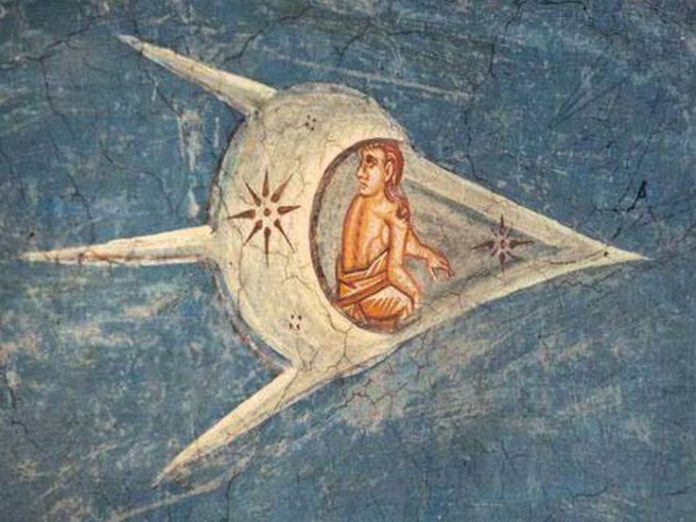 Reč je o dva neobična predmeta u obliku suza sa zracima u kojima se nalaze osobe. Zraci stvaraju utisak kretanja, pa oni koji veruju u NLO tvrde da je reč o vanzemaljskim letelicama. Ono što je još mističnije je činjenica da su bića u „letelicama” prikazana u veoma neobičnim oblicima potpuno atipičnim za slikarstvo XIV veka.