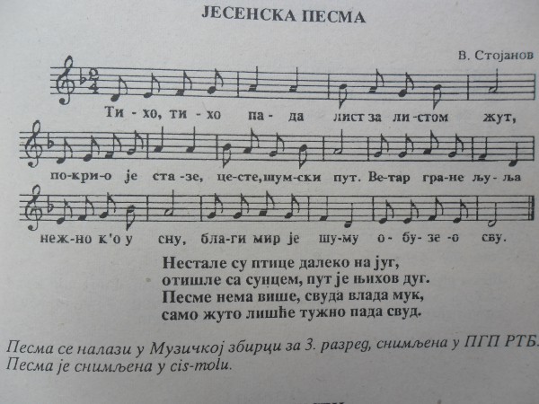 foto:eventkeeper.com avg 3, 2014 Muzička zbirka: Jesenska pesma Izvor: Orijentacioni raspored nastavnog gradiva sa didaktičko-metodičkim uputstvom za 3.razred osnovne škole ključne rečijesenjesenska pesmamuzička zbirkatreći razred FacebookTwitterEmailViberReddItWhatsAppTelegramPrintPinterestTumblrLinkedinMixVKDiggLINENaver Facebook Prethodni tekstSENKE NA ASFALTUSledeći tekstFotografija dana Jovanka IgnjatovićJovanka Ignjatović voli svakoga dana da nauči nešto novo. Svaki dan za nju predstavlja novi izazov. U izazovima vidi mogućnost da bude bolja. PROČITAJTE! Otvorena vrata Hiljade Božićnih paketa Lajflajn Čikaga za decu bez roditeljskog staranja stigli u Kraljevski dvor Zoran Todorović - dec 11, 2025 Atelje Dječije stvaralaštvo kao poklon gradu: Objavljena knjiga „Baru na dar 2“ Zoran Todorović - dec 11, 2025 Kultura Proslavljen Međunarodni dan volontera pod sloganom „Lokalno – svugde prisutni“ Crveni krst Srbije - dec 7, 2025 Satatatira IN MEMORIAM Ilija Marković Deana Sailović - sep 11, 2016 Mesečina Neverstvo Nenad Živković - maj 24, 2016 Mesečina Tode Nikoletić: Leptir Tode Nikoletić - maj 7, 2025 Knjige Oraj sa Busovnika – nova knjiga Rajka Joličića Zoran Todorović - maj 17, 2022 Satatatira Kariktura dana Darko Drljević - mar 12, 2018 Magazin Olga Tomović: Povratak viteza Olga Tomović - jun 1, 2018 Otvorena vrata Likovni rad dana: Jesenje drvo Jovanka Ignjatović - jul 4, 2017 Priključenija Kokoškov saopštio spisak: Mnogo smo jaki Zoran Todorović - maj 31, 2021 Otvorena vrata Završni ispit na kraju osnovnog obrazovanja Bojana Pudar - apr 29, 2014 Mesečina Na pravi put – Srećko Aleksić Srećko Aleksić - maj 24, 2019 Strip Internacio-naši 08: Ono naše što nikad ne beše (Nova Panonija) Ivan Veljković - maj 1, 2016 Zanimljivosti Vic dana: Je li visoka? Đorđe Todorović - apr 2, 2018