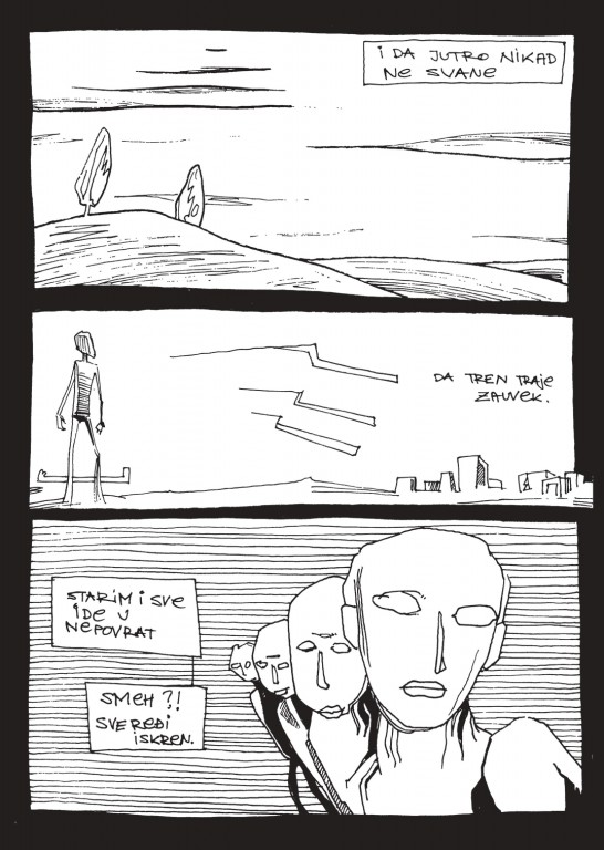 A to narušavanje strukture radi radikalnog izgrađenja nove se nazire i kod četvrtog „čajdžije“; Dušan Cvetković, pored toga što ima dosadni posao urednika ovog izdanja, ima i nimalo dosadni posao dopunjavanja umetničkog izraza prethodne trojice sopstvenim, i to, barem stripovski, u sklopu „Art booka“ radi samo četiri puta. Glavnina njegovih ostalih radova ovde su ilustracije, i to ilustracije koje debelo varijaju po tematici i prikazu, ali koje nisu bez vezivnog tkiva. Tako ilustracije na stranama 23, 26, 27 i 45, kao i kratki strip na str. 46, sadrže anđele ili anđeoske figure, na stranama 24 i 25 su primetni uticaji feudalnog Japana, a na stranama 28 i 29 žene i maske. Tačnije, tanke, sitne, prosečno odevene, prosečno građene, neimpresivne žene i maske koje na ovaj ili onaj način skrivaju pravo lice. Anđeli su ti koji ovde evociraju najviše spekulacija (štaviše, slike s japanskom tematikom deluju namenski i prečišćeno, kao da su pre naručeni proizvod nego lični umetnikov izlet u kreiranje; naravno, ovo je samo pretpostavka od strane autora ovog teksta), pogotovo anđeo na strani 27, sa melanholičnom atmosferom, skoro pa praznim ambijentom, ali i uz blagi izlazak iz zakona fizike lebdenjem sedećeg anđela na geometrijskom obliku namesto leta istog. Šta god da je konačna tema predloženog na slici, sigurno je da je to nešto debelo prigušeno spoljašnošću, pa makar to bilo čudo prirode, nauke, vere ili umetnosti. Cvetkovićev najduži strip u „Art booku“ je, barem na jednom nivou, još jedna u nizu priča o „njoj“, o nekoj ženskoj osobi koja na ovaj ili onaj, ili pak taj tamo, način obitava u umu kreatora. Uz malo upletene egzistencijalne krize, krize identiteta, krize delovanja, krize telesnog zdravlja i sigurno još par kriza koje nisu potpuno ili delimično prikazane crtica jasne, ovo delo od šest tabli udara pravu notu prisiljene katarze, ili pokušaja bekstva iz iste. Narator stripa svoju intenzivnu prolaznost lamentuje ispod velikog crnog krsta, samog po sebi simbola trajanja u bilo kojem smislu. Strip na strani 48 je ekvivalent ovom prethodnom po većini navedenih elemenata. Iz oba se oseća poteškoća, teskoba, teg, sve moguće teške reči na „t“. Zato su kraći stripovi na stranama 46 i 47 malko lakši i pozitivniji; Cvetković ipak nije persona spremna za podsticaj na samomorenje, već kvalitetno koristi svoje alternativne autorske angažmane i da zasmeje pokojeg čitaoca.