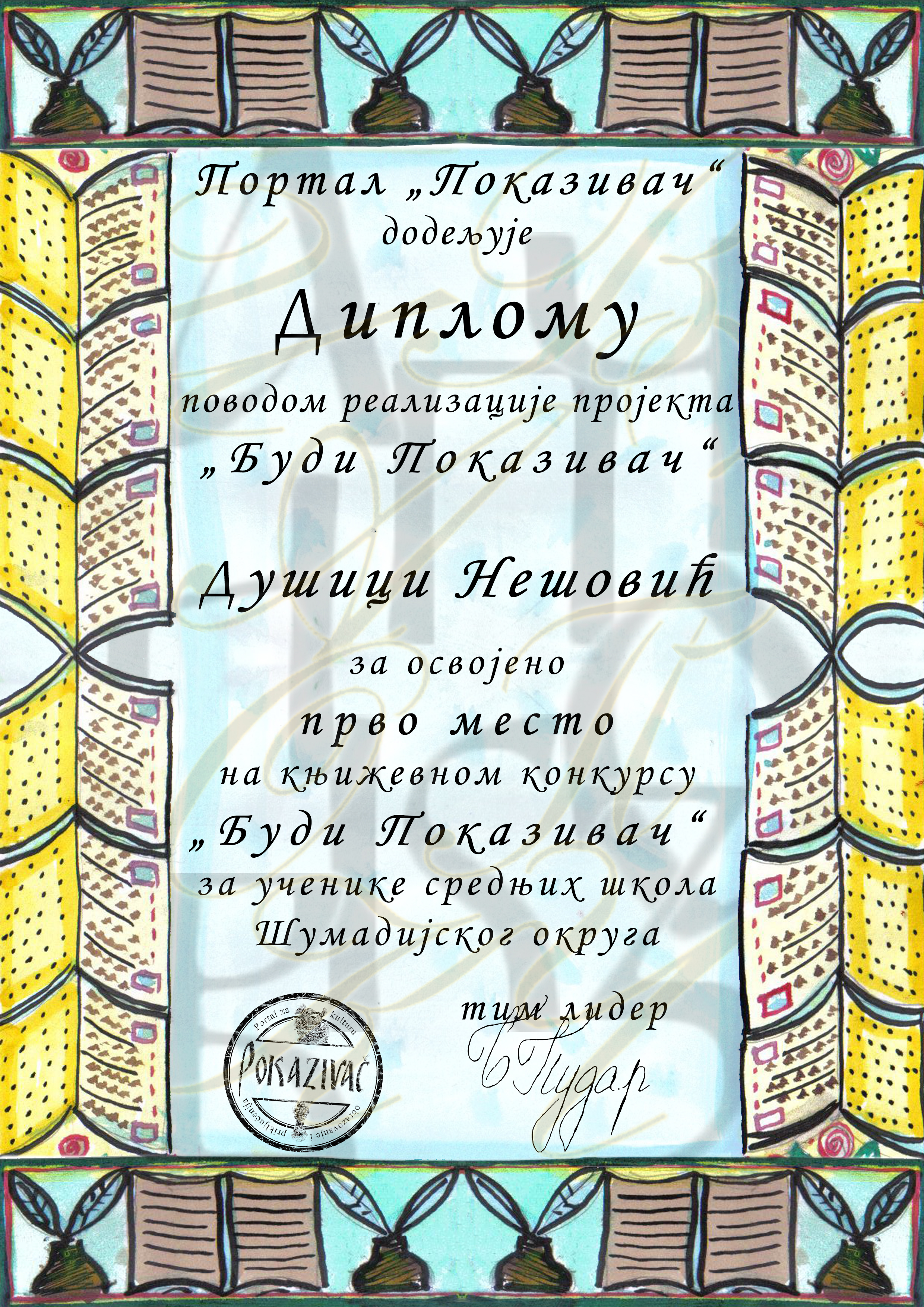 Награђени најбољи радови на наградном књижевном конкурсу за ученике средњих школа Шумадијског округа под називом „БУДИ ПОКАЗИВАЧ“