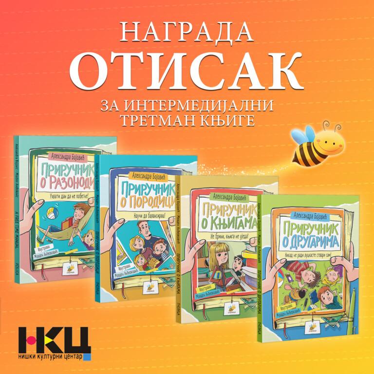 Edicija Zabavnih priručnika za decu Izdavačke kuće PČELICA dobitnik je Nagrade „Otisakˮ za intermedijalni tretman knjige, na 59. Niškom sajmu knjiga. Ediciju čine četiri priručnika: Priručnik o drugarima, razonodi, porodici i knjigama, autorke Aleksandre Bojović i ilustratora i dizajnera Mladena Anđelkovića.