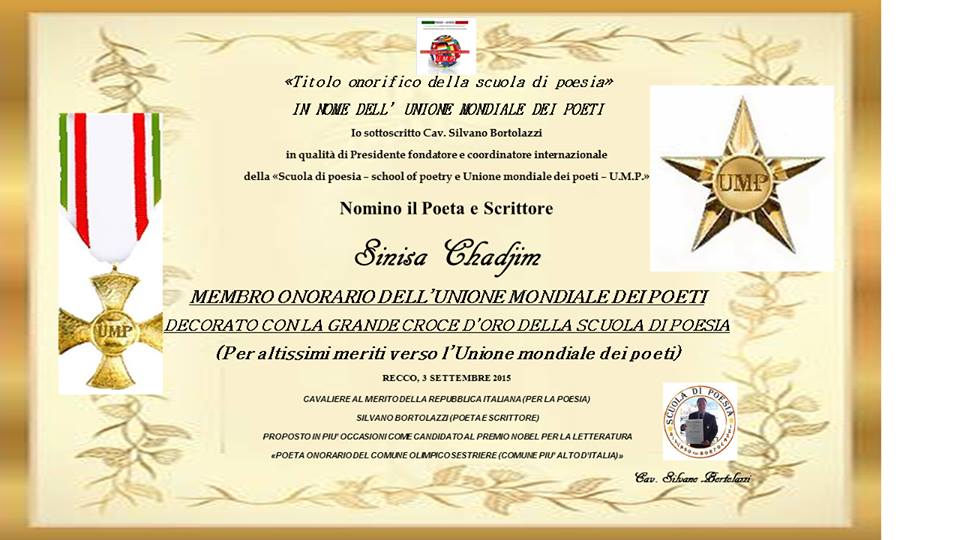 „Počasni član Svjetske unije pjesnika ukrašen Velikim križem zlata škole poezije“
