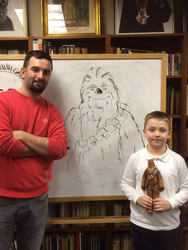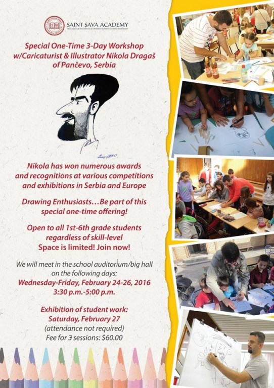 U Americi tj. u Čikagu sam proveo dve nedelje, tamo sam održao trodnevnu radionicu karikature u osnovnoj školi Akademiji Sveti Sava. Na radionici je bilo 15 polaznika, dece od 7 do 12 godina, a sama škola broji oko 60 đaka, u ovoj školi se nastava održava na srpskom i engleskom jeziku. Na radionici smo se bavili kreativnim razmišljanjem, portretnom karikaturom i stripom. Posle ovih radionica, takođe su interesovanje pokazala i srpska deca koja ne idu u ovu skolu, pa je radionica odrzana i za njih, i tu je bilo 20 polaznika. Pored radionica tamo sam imao i izložbu dece ilustracije koja je odrzana na donatorskoj večeri, gde se sakupljao novac za obnovu i saniranje manastira Presvete Bogorodice u Indiani. Specijalno sam za to donatorsko veče uradio seriju od tri karikature “ Srbin u Čiakagu“, i sve tri su prodate na aukciji, i novac je otisao kao pomoc za manastir, a meni je srce bilo puno sto sam mogao da pomognem.. Najvecu zahvalnost dugujem Svesteniku Radovanu Jakovljeviću koji je prepoznao to sto radim, i pozvao me da to podelim sa našom decom u Čikagu. U Čikagu obisao sam The Field Museum, The Art Institute, Park milenijum, Shedd Aquarium, Atlantic center. I Srpske svetinje: Hram Vasksenja Hristovog, Crkvu Sveti Sava i Manastir Gračanicu u Libertivilu, i Manastir Presvete Bogorodice u Indiani. Pored toga sto sam stekao prijatelja za ceo život, mislim na oca Radovana, i što sam video mnogo toga, družio se sa divnim ljudima, i što su reakcije dece na radionici bile vise nego pozitivne. Na mene su najveci utisak ostavila dva dečaka Andrej i Dusan. Od Andreja sam dobio pismo, koje nema cenu, gde on izražava svoju zahvalnost sto je naucio da crta, Dusan me je dirnuo, jer nije hteo da spava dok ga ne nacrtam, i njegov tata je morao da dođe po mene, i kada sma ga nacrtao on je pogledao gore ka Bogu i rekao: „Hvala ti za najbolji dan u zivotu“…