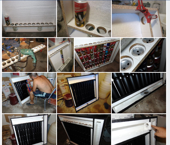Tako napravljen ram od jednog kvadrata izolovao sam stiroporom od tri centimetara, sve to sam zaštitio crnom folijom i napravio ležista za limenke koje sam, takođe, ofarbao u crno. Tako jače upijaju sunčevu toplotu.